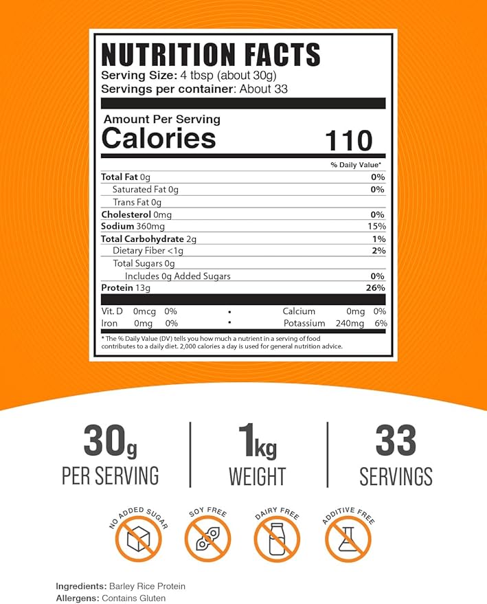 - Maximize Your Potential: Support your active lifestyle with our Barley Rice Protein powder, a vegan protein alternative. Each serving gives you 30 grams per serving to help boost your strength and reach your fitness goals, whether you're an athlete or staying active.