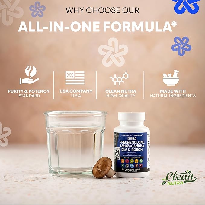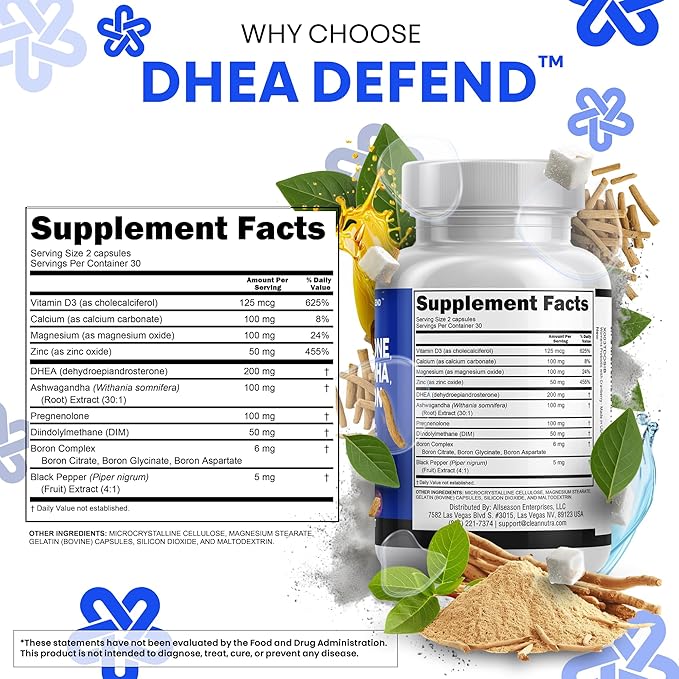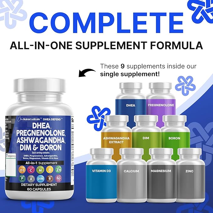 DHEA 200mg Supplement Pregnenolone 100mg for Men & Women with DIM Ashwagandha Boron 6mg Complex Calcium Magnesium Zinc 50mg Vitamin D3 5000 iu Hormone Support Capsules Pills - Made in USA 60 Ct