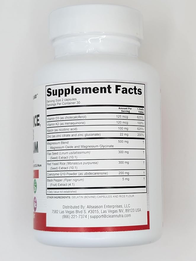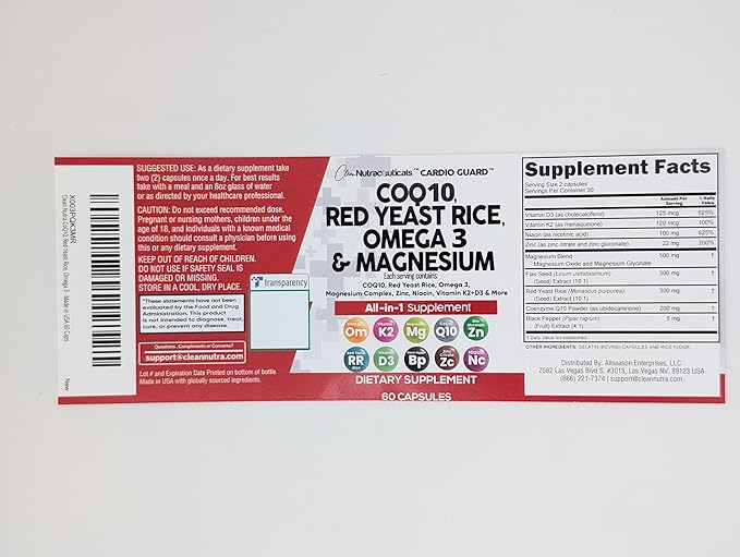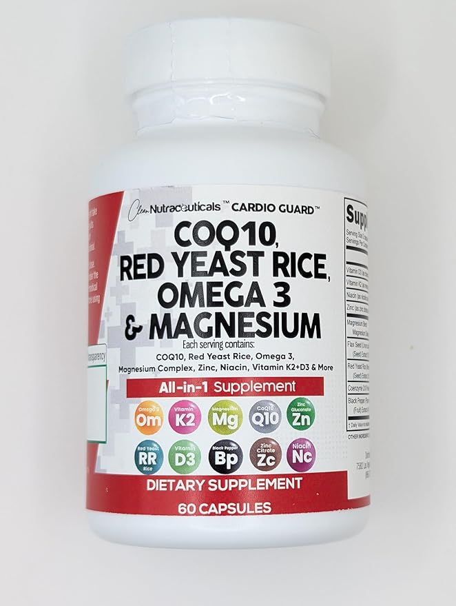 - The All In One CoQ10 and Red Yeast Rice Supplement You've Been Looking For - Clean Nutra CardioGuard provides 8 full-dose products in one complex containing a full CoQ 10, Red Rice Yeast Supplement, Omega 3 Fatty Acid Supplements, Magnesium Capsules, Niacin, Zinc, and Vitamin K2 D3 in a convenient 2 capsule dosage. Finally, a stronger supplement than red yeast rice 600 mg. capsules, and omega 3 have been packed into one convenient solution.
