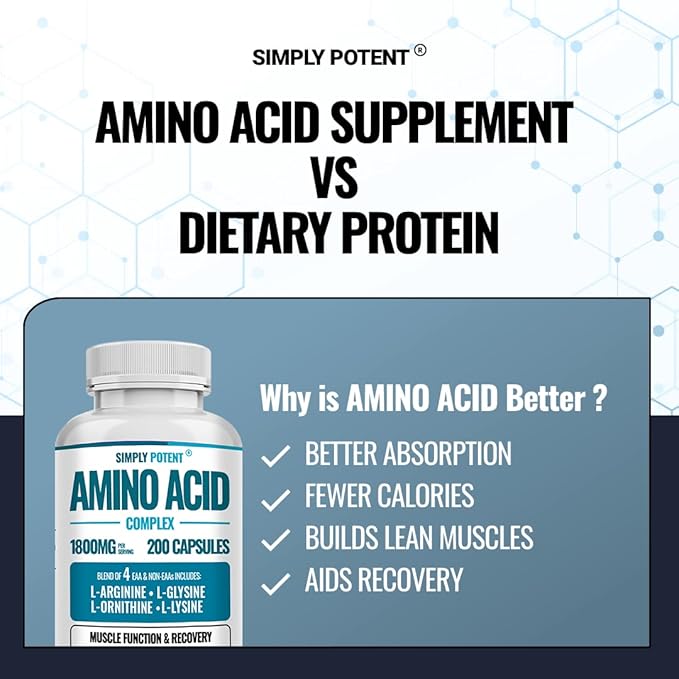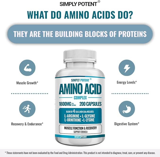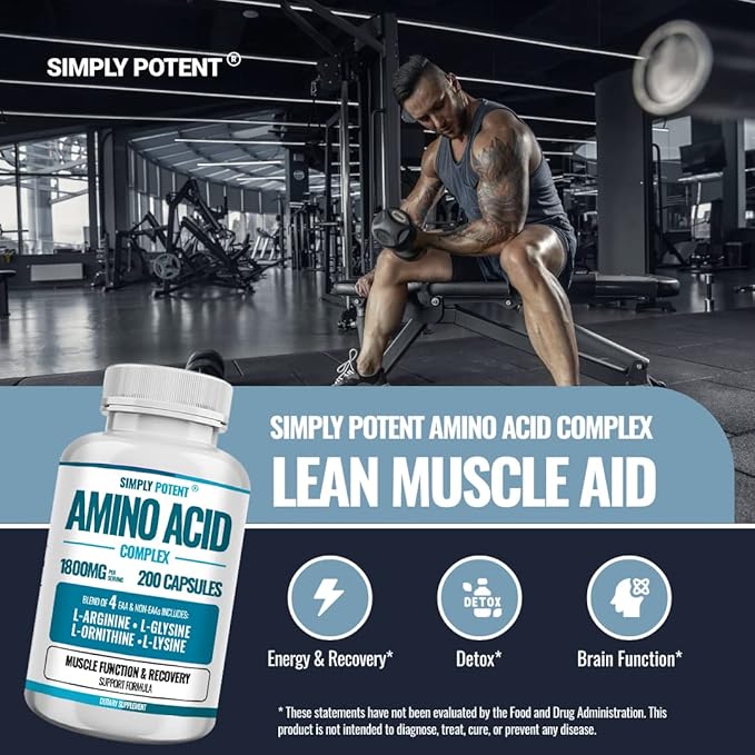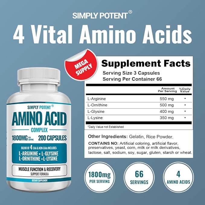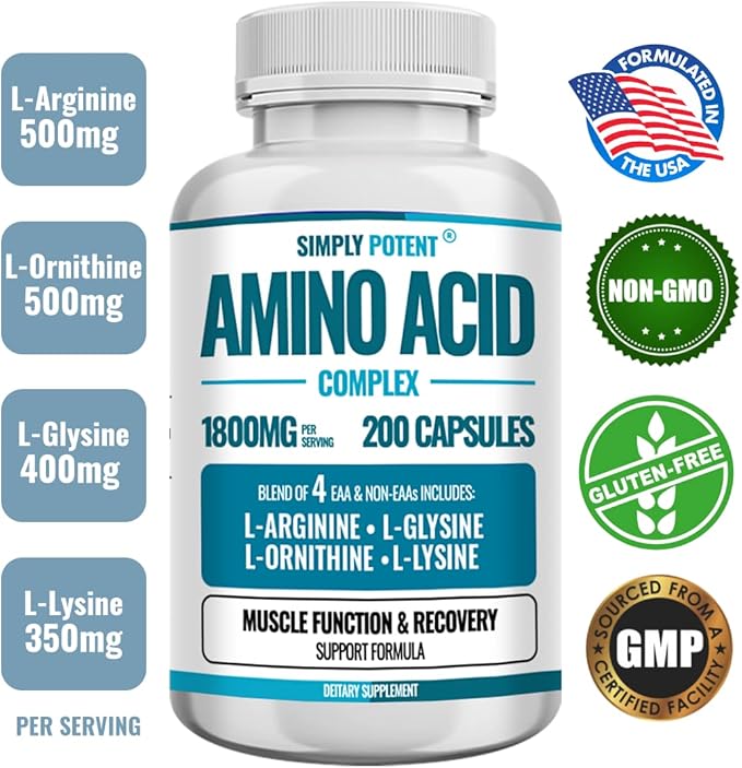 Simply Potent Amino Acid Complex 1800mg 200 Capsules, Blend of 4 Essential and Non Essential Amino Acids, Includes L-Arginine 550mg, L-Ornithine 500mg, L-Glysine 400mg & L-Lysine 350mg for Muscle