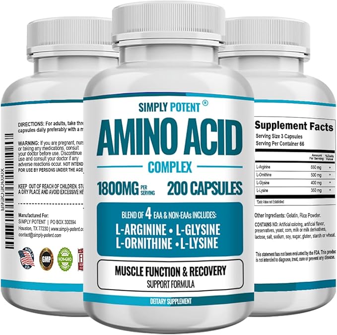 - Amino Acid Complex 1800mg 200 Capsules, Blend of 4 Essential and Non Essential Amino Acids, Includes L Arginine 550mg, L Ornithine 500mg, L Glysine 400mg & L Lysine 350mg for Muscle Growth & Recovery