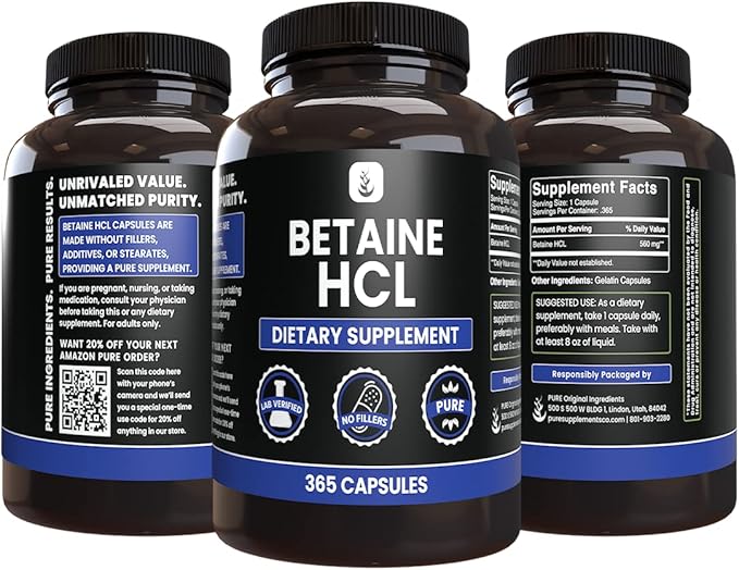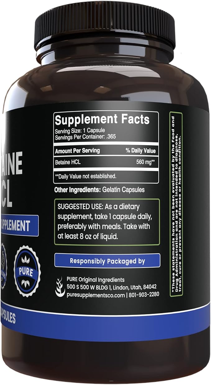 - Pure Original Ingredients Betaine HCL Capsules are filled with a single ingredient, providing a pure undiluted supplement