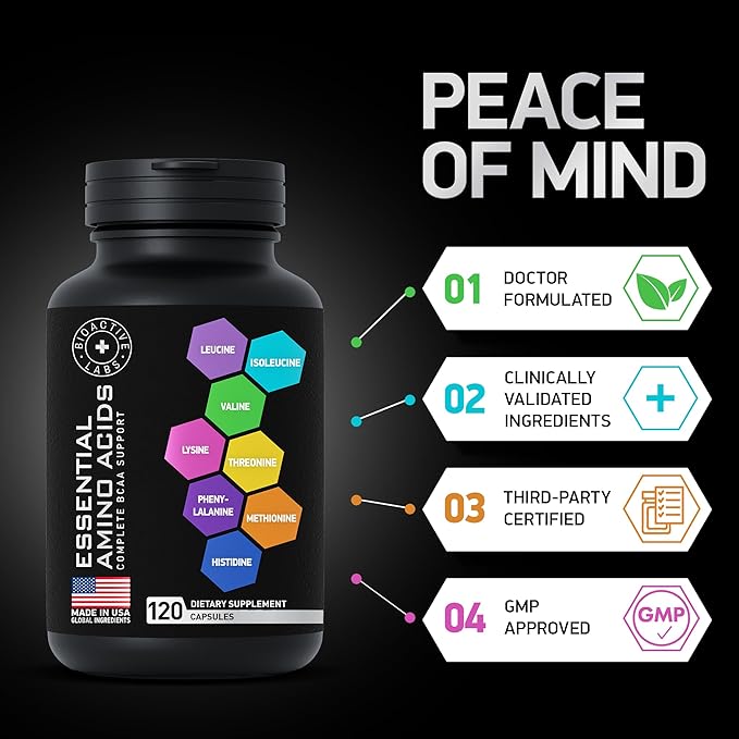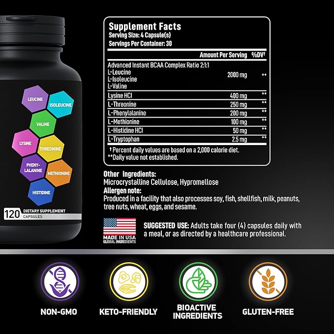 - EASY-TO-TAKE CAPSULES - Full branched chain amino acids muscle strength support. Rapidly absorbed essential amino acids supplement for women and men in convenient capsules to easily incorporate into your fitness routine.