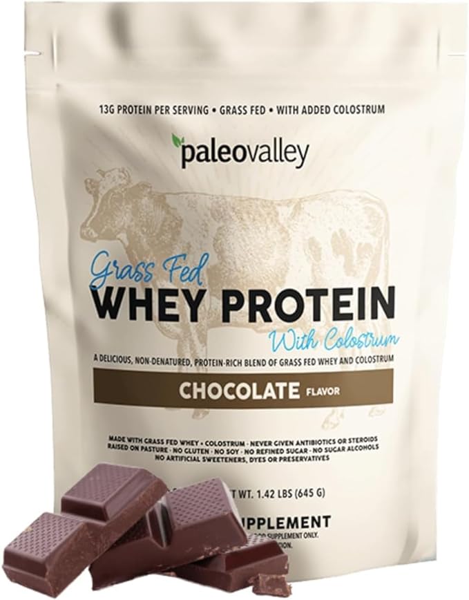 Paleovalley 100% Grassfed Whey Protein Powder with Colostrum, 13g Protein, Chocolate, Muscle Building, Immune Support, Gut Health, 30 Servings