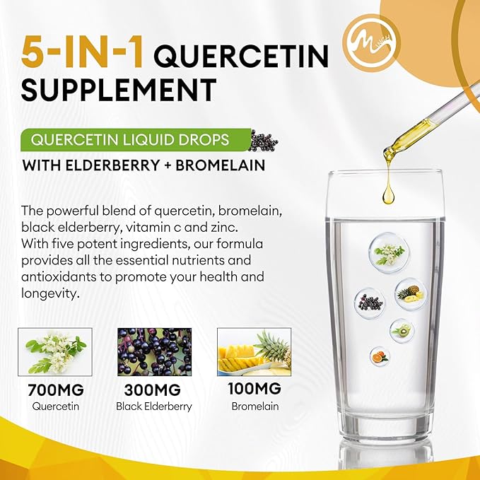 - 5 IN 1 Quercitin Liquid Drops: Quercetin is a bioflavonoid that can support your body on a cellular level and supports healthy seasonal immune system function. Our vegan liquid quercetin with bromelain & elderberry & zinc & vitamin C, can support skin health, vision support, brain function, blood circulation, mood support, bone support, and improved muscle function.