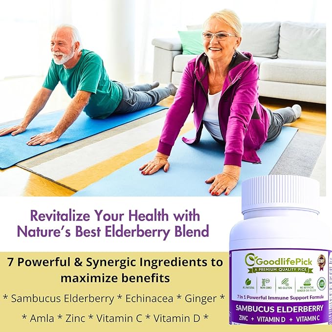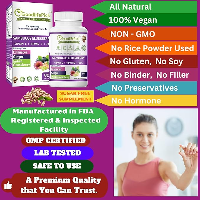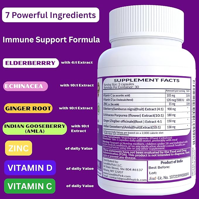 - ** GOODLIFEPICK - 7X POWERFUL IMMUNITY SUPPORT FORMULA WITH POWERFUL ANTI-OXIDANTS - Elderberry blended Echinacea, Indian Gooseberry (Amla), and Ginger add Extra Strength to Elderberry Formula that makes it best available Elderberry Immune Support Formula