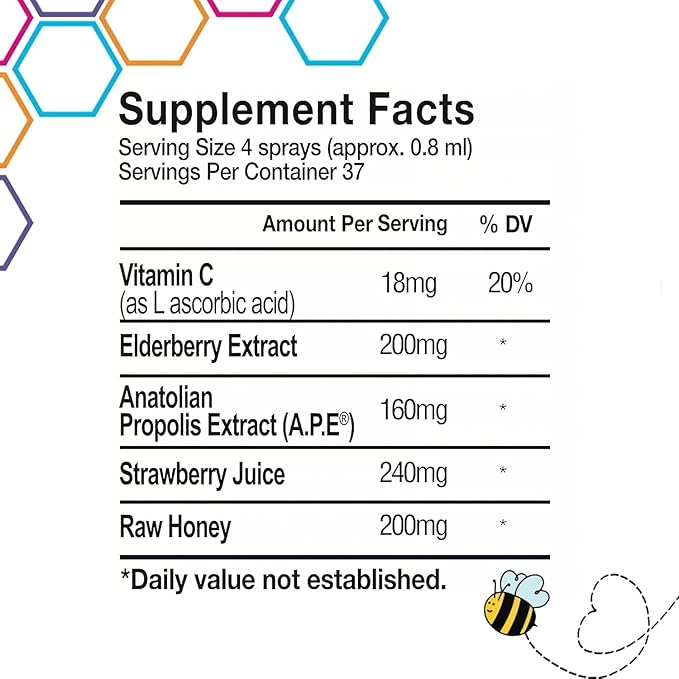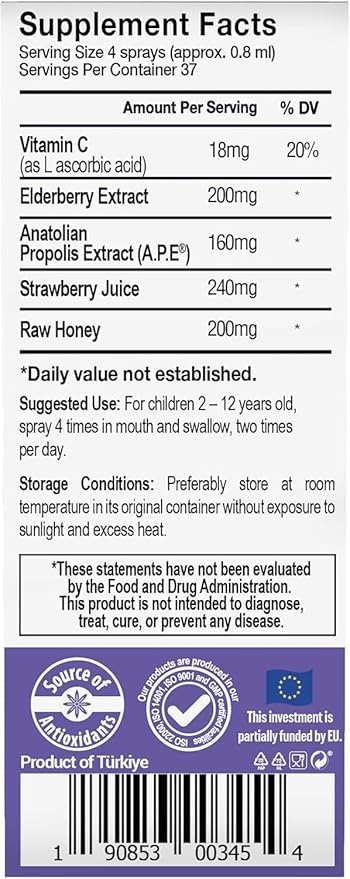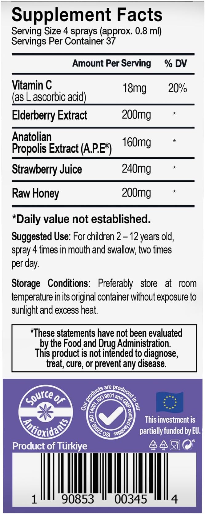 - KIDS IMMUNE SUPPORT: It is formulated with only 5 ingredients: Elderberry, Anatolian propolis extract, Vitamin C, Raw Honey, and Strawberry Juice. It has 15 mg/mL of antioxidants and supports your child's immune system naturally. Per serving (4 sprays): 200 mg Elderberry, 160 mg Anatolian Propolis Extract, 18 mg Vitamin C (20% of the daily value), 240 mg Strawberry, and 200 mg Raw Honey.