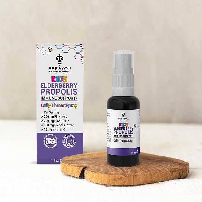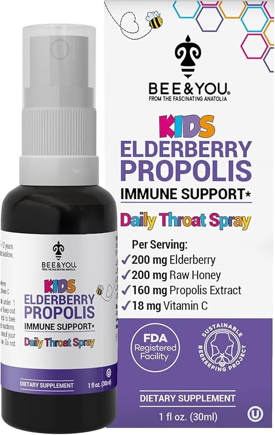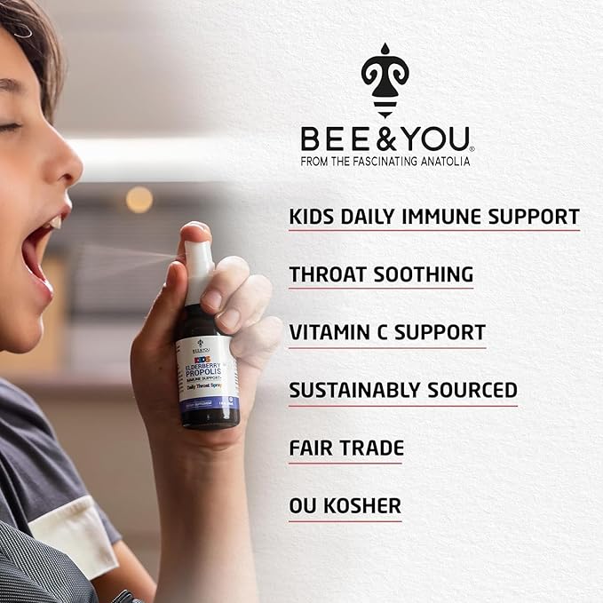 Bee and You, Kids Immune Support Supplement Throat Spray, Elderberry, Raw Honey, Propolis Extract, Vitamin C, Strawberry Juice, Antioxidants, Sore Throat Relief, 1 fl. Oz