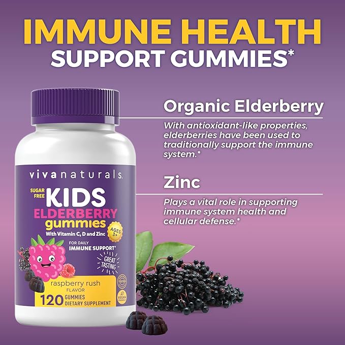 - 8-in-1 Daily Immune Support for Kids*: Give your child daily immune support with our delicious, sugar-free elderberry gummies.* Our kids elderberry gummies deliver a comprehensive blend of Sambucus Elderberry, Zinc, and essential Vitamins A, C, D, E, B6, and B12 for year-round wellness.*
