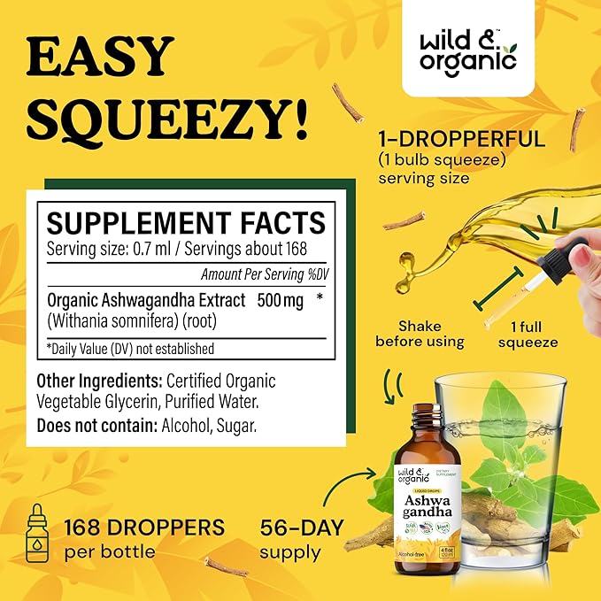 - Alcohol-Free: Wild & Organic ashwagandha liquid drops are vegetable glycerin-based, providing an alcohol-free tincture that is easy on digestion.