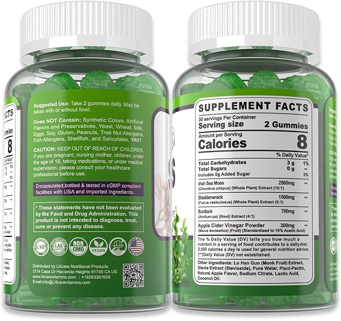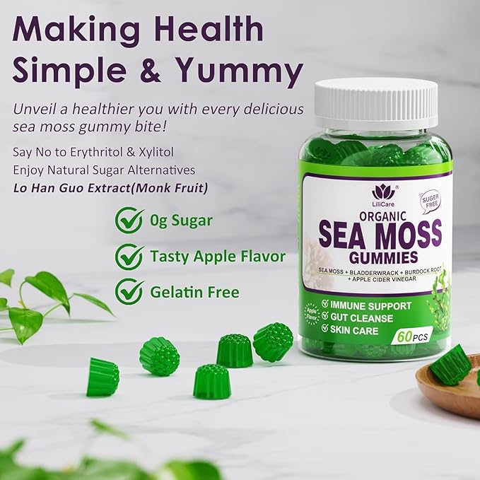 - 👌 cGMP Certified, Quality assured: Lilicare Sea moss gummies for women and men are proudly crafted in cGMP-compliant facilities, encapsulated, bottled & third-party tested to ensure safety, purity and potency. Sugar-Free, Non-GMO, gluten-free, soy-free, wheat & yeast-free, 100% vegan, free from artificial colors and flavors. If you have any questions, please contact us, we will solve it for you as soon as possible. Your satisfaction is our TOP Priority.