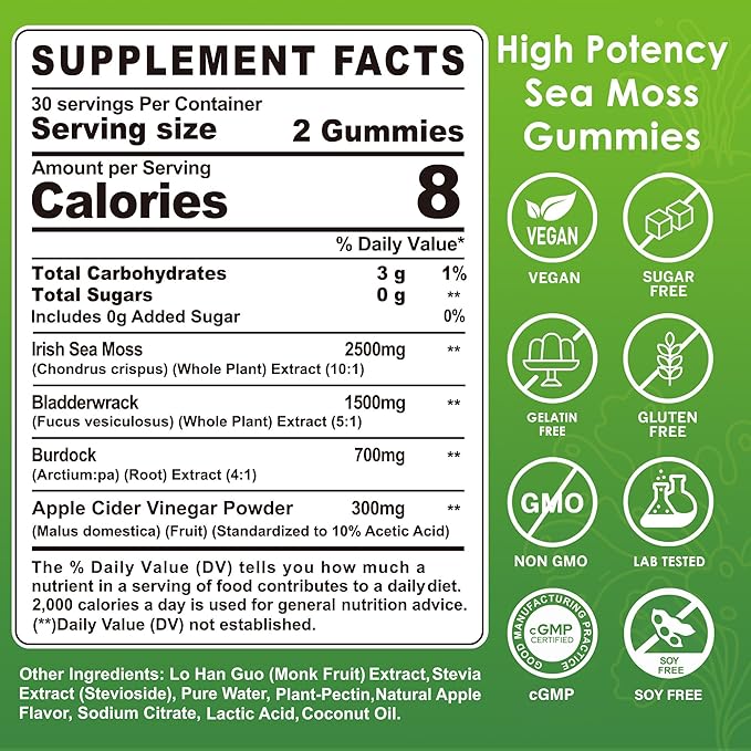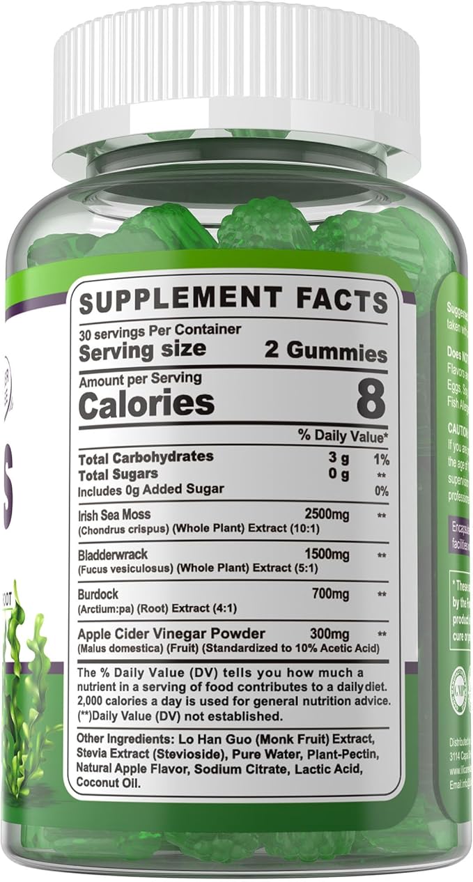 - High Potency Sea Moss Gummies: Our sea moss supplement is made from wild & organic Irish Sea Moss, which has higher levels of minerals & unique nutrients. Sea Moss Supplement are enriched with Bladderwrack, Burdock Root and Apple Cider Vinegar to cater to your nutritional needs. They are sugar-free and delicious, making you say goodbye to large Sea Moss Capsules, Tablets or Pills.