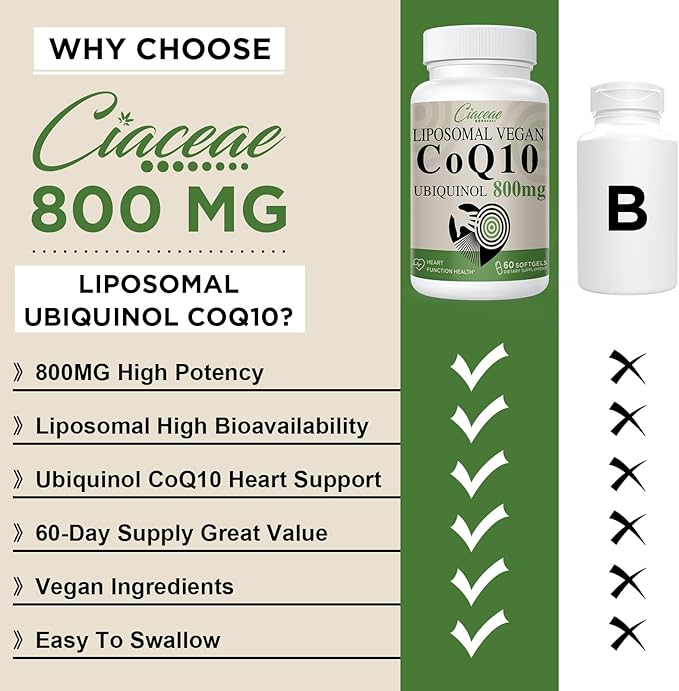 - PURE CoQ10 800 MG SOFTGELS: Each softgel contains 800mg pure CoQ10 and features double potency co q10, unlike normal coq10 100 mg; 200 mg; 300 mg; 400 mg; 600 mg, Ciaceae coq10 800mg maximizes and restores natural CoQ10 to ideal levels
