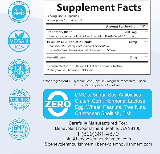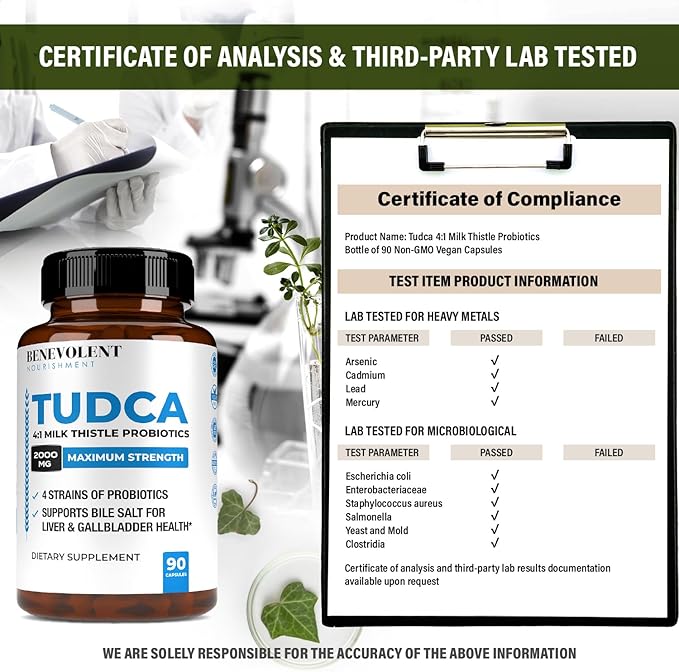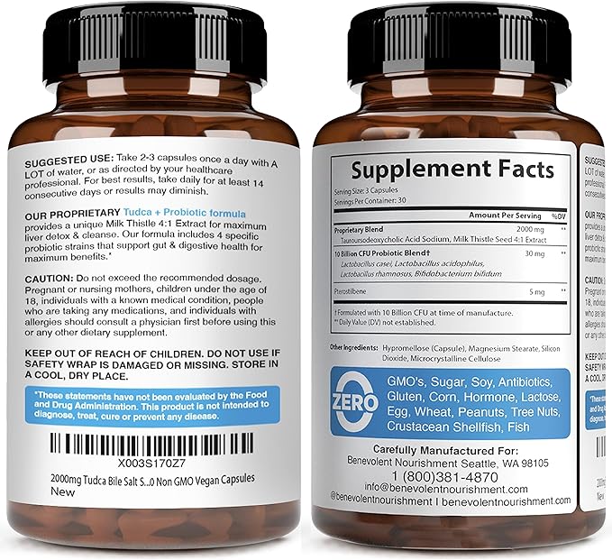 - Unique and powerful formulation - Benevolent Nourishment's Tudca supplement contains 2000mg of tudca blended with milk thistle and 4 strains of premium probiotics with 10 billion CFUs. These potent ingredients are more than enough to support liver detoxification, boost bile production, balance liver enzymes, promote thyroid health, support the immune system and cognitive function, and help balance your body's natural systems naturally in just one capsule!