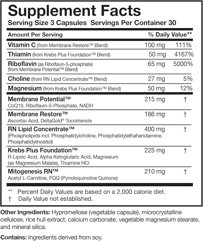 - Vegetarian & GMO-Free - Mitochondrial supplements manufactured without milk, eggs, fish, crustacean shellfish, tree nuts, peanuts, wheat, corn, and gluten. Produced in a facility that may process other ingredients containing these allergens. Contains RN Lipid Concentrate & choline supplements derived from soy.