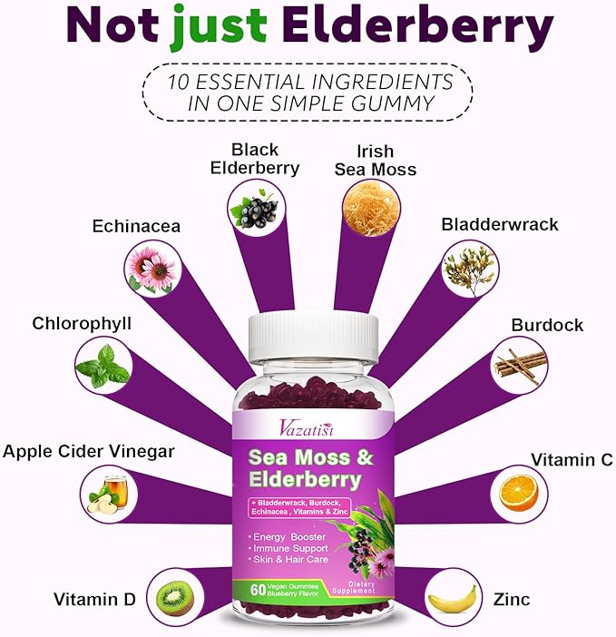 - 10-in-1 Powerful Formula, Naturally Effective: This elderberry gummies are packed organic Irish sea moss with elderberry, chlorophyll,apple cider vinegar, echinacea, bladderwrack, burdock root as well as vitamins C, D & zinc. We work with pure and natural ingredients to deliver effective solutions that are kind to your body, from the inside out