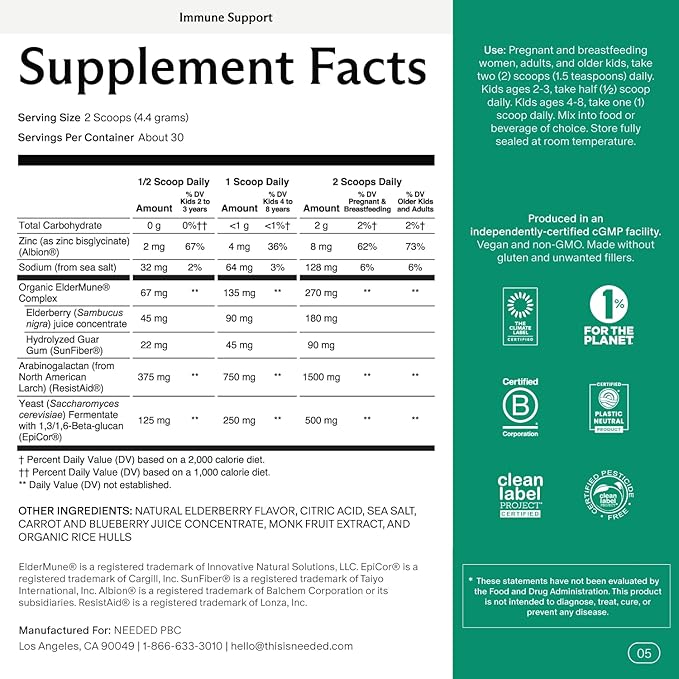 Needed. Immune Support Immunity Powder - for The Whole Family - Pregnancy Safe Immunity Supplement - Zinc with Elderberry - Easy-to-Take