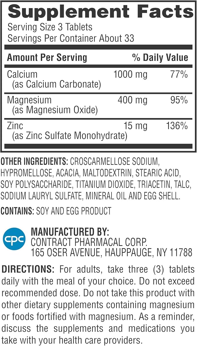 Earth's Splendor 1000 mg Calcium, 400 mg Magnesium, and 15 mg Zinc, Heart and Immune System Health, Bone and Muscle Support Supplement, 100 Tablets 1 + Month Supply