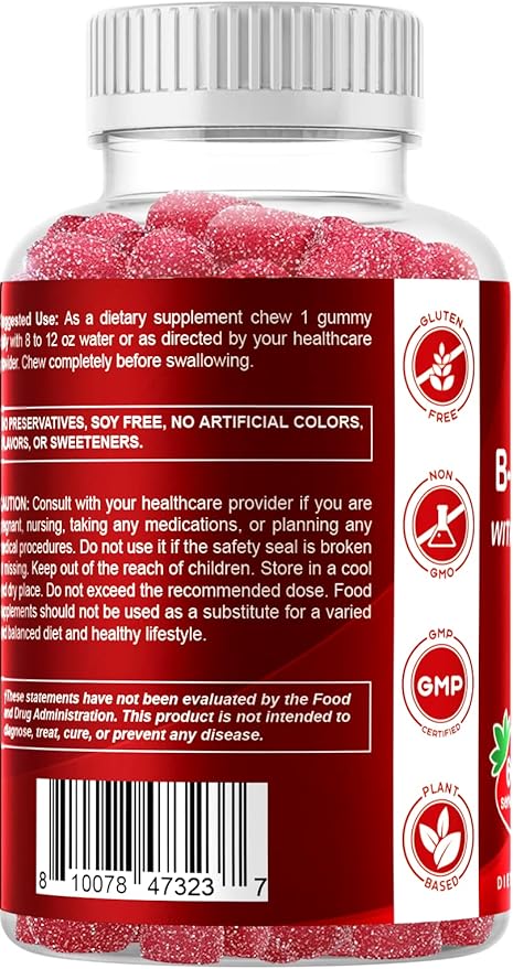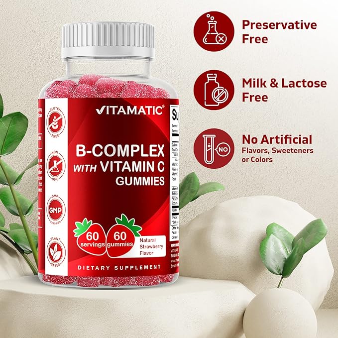 Vitamatic Vitamin B Complex Gummies with Vitamin C & Inositol - Natural Strawberry Flavor - 60 Gummies (2 Bottles)