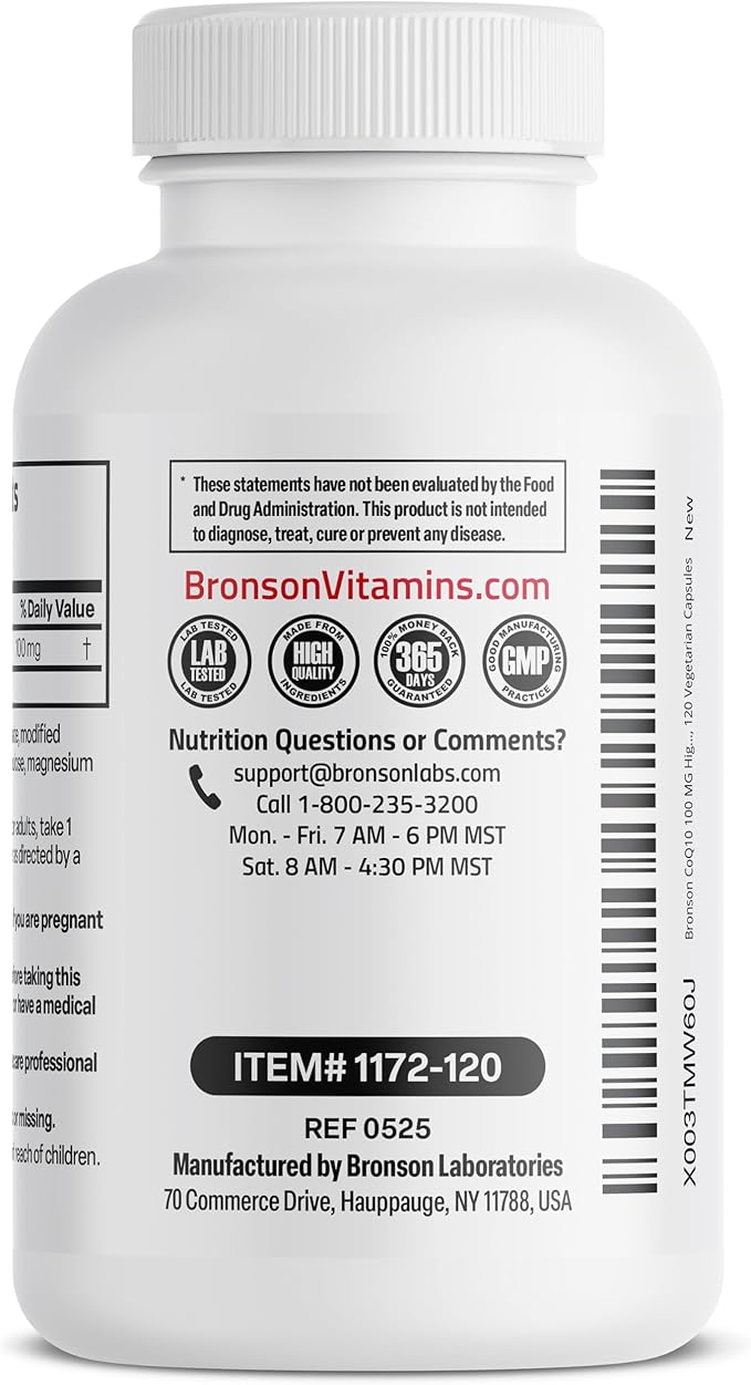 - Superior Quality Vegan/Vegetarian Formula: Laboratory tested Gluten-Free. Bronson products are in-house tested and carefully manufactured by trained professionals in our state-of-the-art facility that is located in Hauppauge, New York. CoQ10 100 MG is Vegan/Vegetarian friendly and contains no ingredients derived from animals.