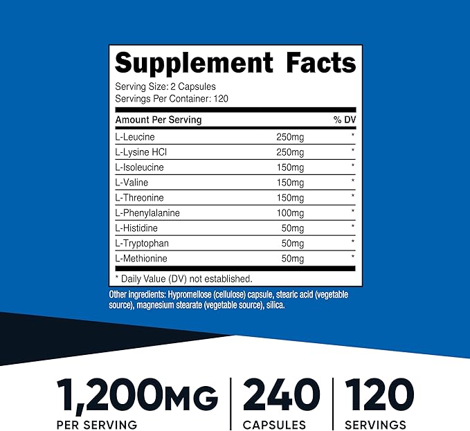 - Nutricost EAA capsules have 1,200mg of EAAs per serving and 120 servings per bottle (2 Caps per Serving)
