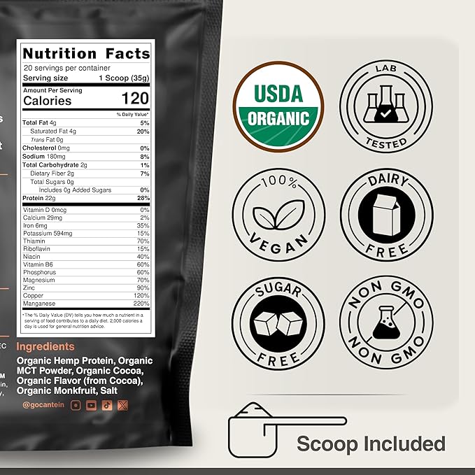 - Certified USDA Organic: Trust in the integrity of our plant-based vegan protein powder, which is certified USDA Organic, non-GMO, and vegan-friendly. Our straightforward label and simple ingredients ensure transparency and quality. Protein is sourced from all organic hemp seeds.