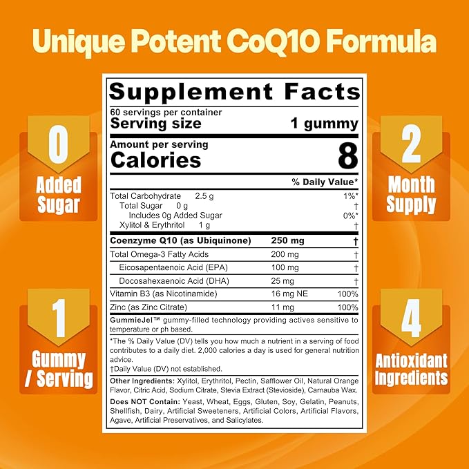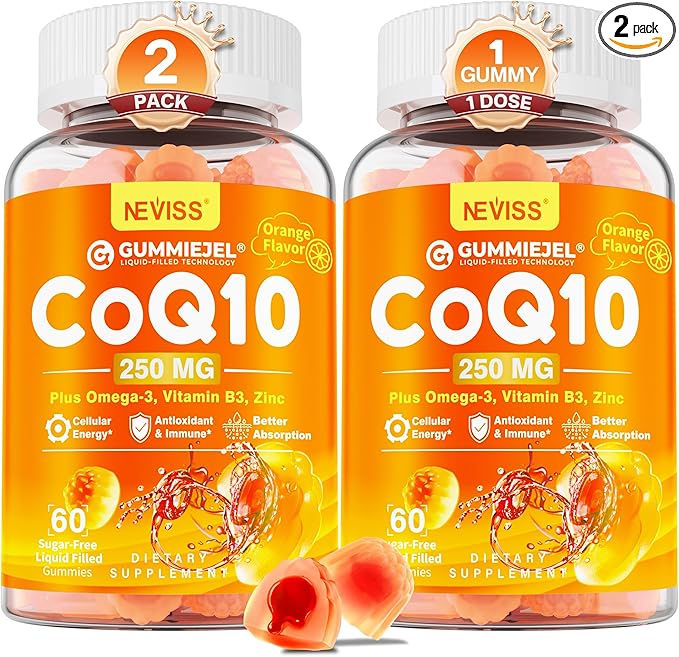 - ELEVATE YOUR COQ10 LEVELS: CoQ10 is your body’s natural energy booster, converting fats and sugars into cellular fuel. However, age, stress, and statin use may deplete your CoQ10 levels. NEVISS's all-in-one formula delivers 250mg of CoQ10 per gummy, enhanced with Omega-3, Vitamin B3, and Zinc for superior absorption and optimal support. With just one delicious gummy a day, you can easily nourish your hear-t and fuel your healthy aging journey—simple, effective, and irresistibly tasty!