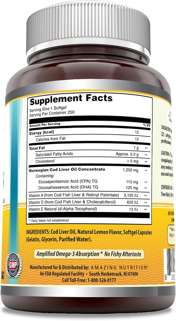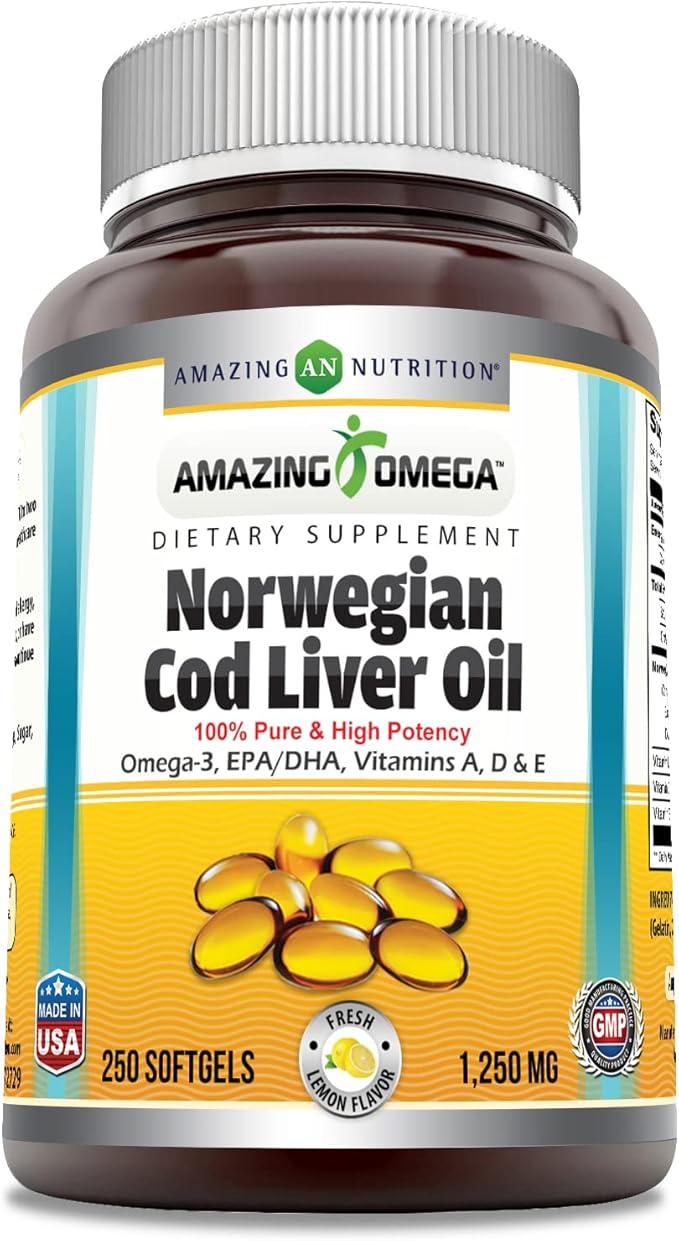 Amazing Omega Norwegian Cod Liver Oil 1250 Mg Softgels Supplement | Omega-3, EPA, DHA, Vitamin A, Vitamin D & Vitamin E (Lemon | 250 Count)