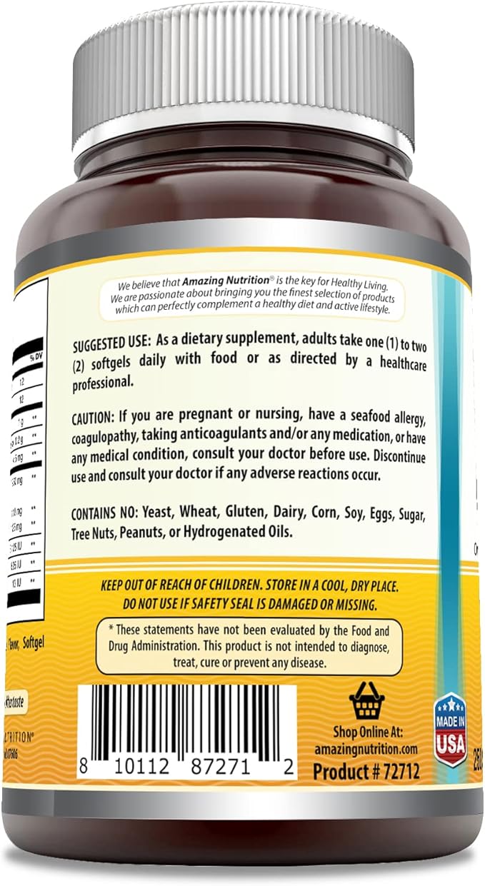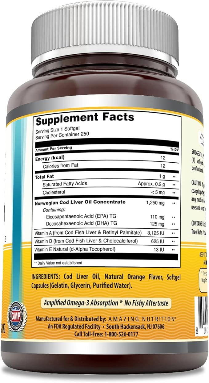 Amazing Omega Norwegian Cod Liver Oil 1250 Mg Softgels Supplement | Omega-3, EPA, DHA, Vitamin A, Vitamin D & Vitamin E (Orange | 250 Count)