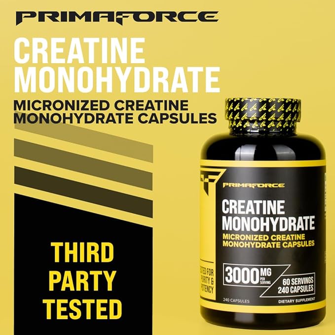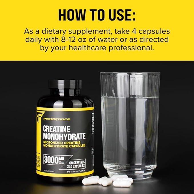 - Convenient and Efficient: With 240 capsules per bottle, PrimaForce Creatine Monohydrate Capsules provide an ample supply to fuel your training for an extended period. The easy-to-swallow capsules make supplementation hassle-free, allowing you to focus on what matters most: your performance.
