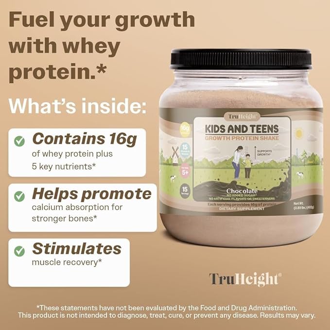- TRUHEIGHT'S WHEY PROTEIN SHAKE FOR CHILDREN & TEENS: TruHeight's delicious protein powder contains a responsibly sourced collection of 18 vitamins and minerals, including 16.5g of protein, Calcium, Magnesium, and Vitamin D, supporting in growth and development. With less than half the sugar of conventional kids products, it’s also the perfect snack for picky eaters!* TruHeight is the #1 Pediatrician Recommended Brand for Growth & Development. *IQVIA ProVoice Survey, March 2025.