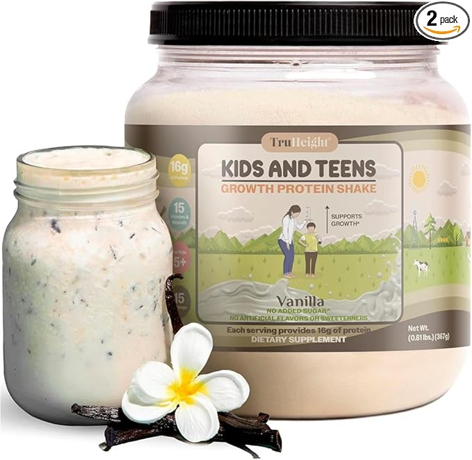- TRUHEIGHT'S WHEY PROTEIN SHAKE FOR CHILDREN & TEENS: TruHeight's delicious protein powder contains a responsibly sourced collection of 18 vitamins and minerals, including 16.5g of protein, Calcium, Magnesium, and Vitamin D, supporting in growth and development. With less than half the sugar of conventional kids products, it’s also the perfect snack for picky eaters!* TruHeight is the #1 Pediatrician Recommended Brand for Growth & Development. *IQVIA ProVoice Survey, March 2025.