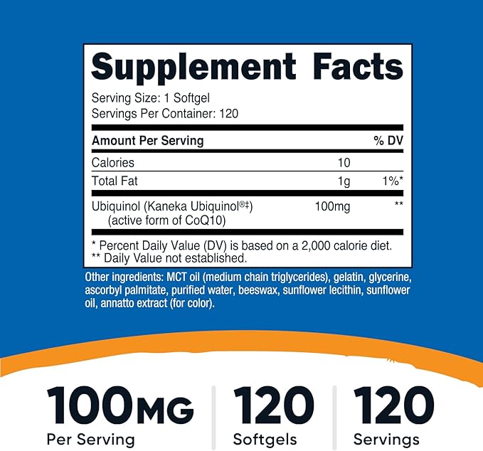 - Ubiquinol supplement for overall wellness: Nutricost Ubiquinol Softgels are formulated to provide a convenient way to incorporate 100mg of this essential nutrient, the active form of CoQ10, into your daily routine.