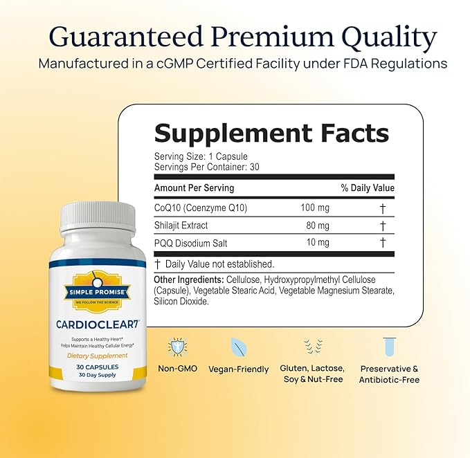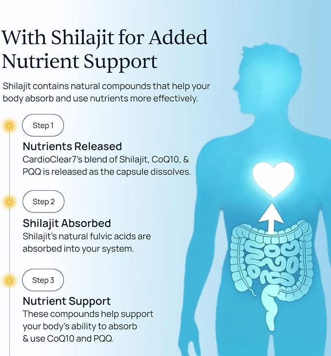 - Supports Energy & Heart Function: CardioClear7 delivers CoQ10, PQQ, and organic Shilajit for women & men to help maintain energy levels, heart health and support overall wellness. This q10 supplement is designed to complement an active lifestyle.