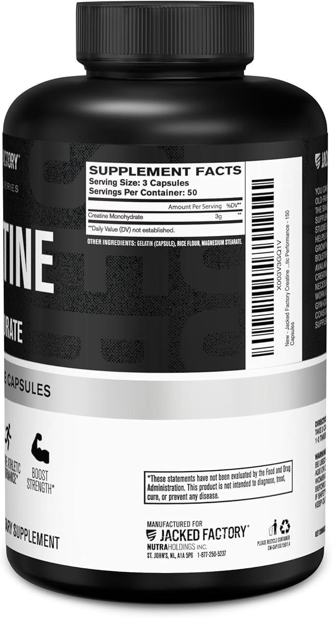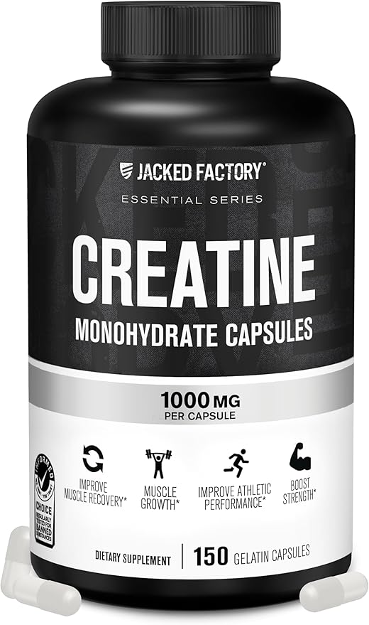 - Pure Creatine Monohydrate for Pre or Post Workout: Jacked Factory Creatine Monohydrate capsules feature 1000mg of pure creatine monohydrate in every capsule. Our capsules allow for convenient dosing of creatine anytime and anywhere without the need to mix it with a liquid.