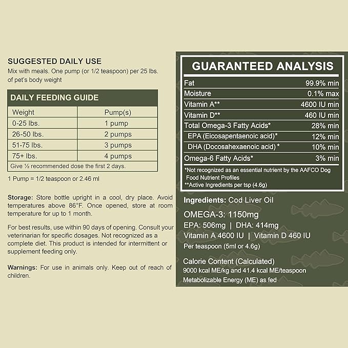 - This Pure Cod Liver Oil is designed for small dogs, large dogs, even massive breeds! The oil adds a delicious flavor that your pet will love! Recommended dosage varies by animal size, consult the package. Made in the USA