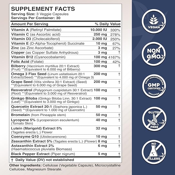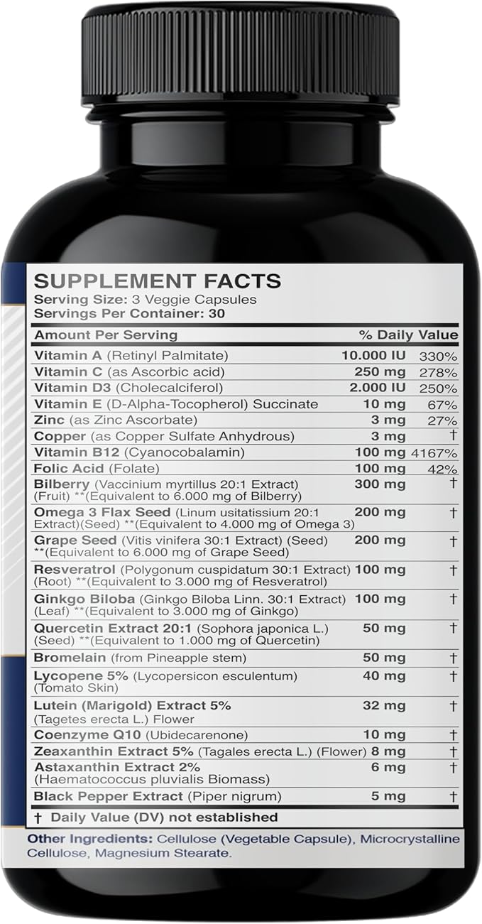 - NATURAL HIGH QUALITY EYE VITAMINS: Lutein plus Zeaxanthin capsules include a range of premium ingredients. Omega 3 amplifies the effectiveness of our formula. Bilberry may protect the retina and improve night vision. Quercetin and Bromelain are well known for their powerful antioxidant properties. Combined with Ginkgo Biloba, Resveratrol and vitamins D, A, E C, B12, our blend offers a holistic approach to eye care