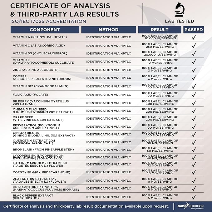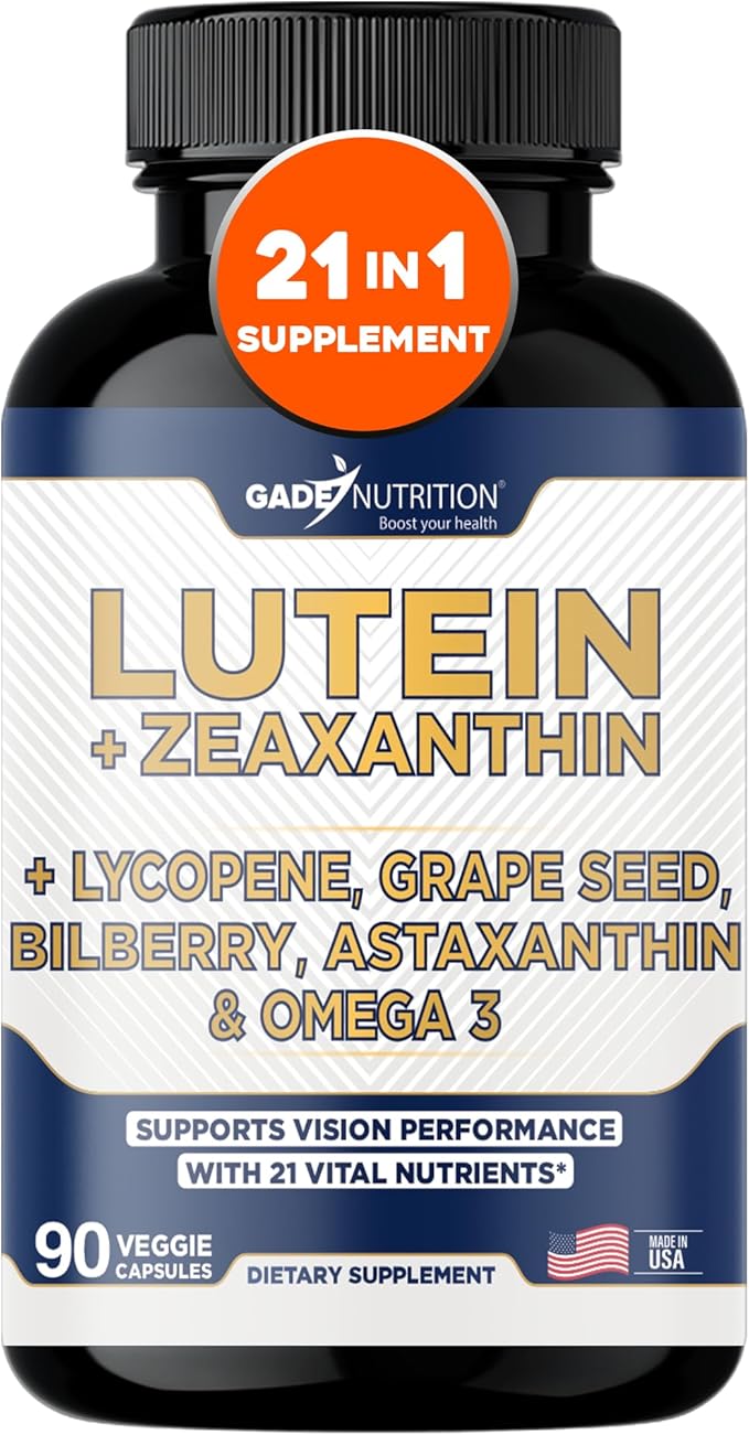 - ADVANCED EYE SUPPORT SUPPLEMENT: Gade Nutrition Lutein with Zeaxanthin supplement has included lycopene, resveratrol, grapeseed, bilberry, astaxanthin, omega 3, vitamin E, and more. Our powerful combination helps neutralize free radicals and support optimal eye health, making our supplement an excellent choice for adults seeking to protect their vision and eye health. Our blend offers exceptional eye care in each capsule, along with other potent antioxidants