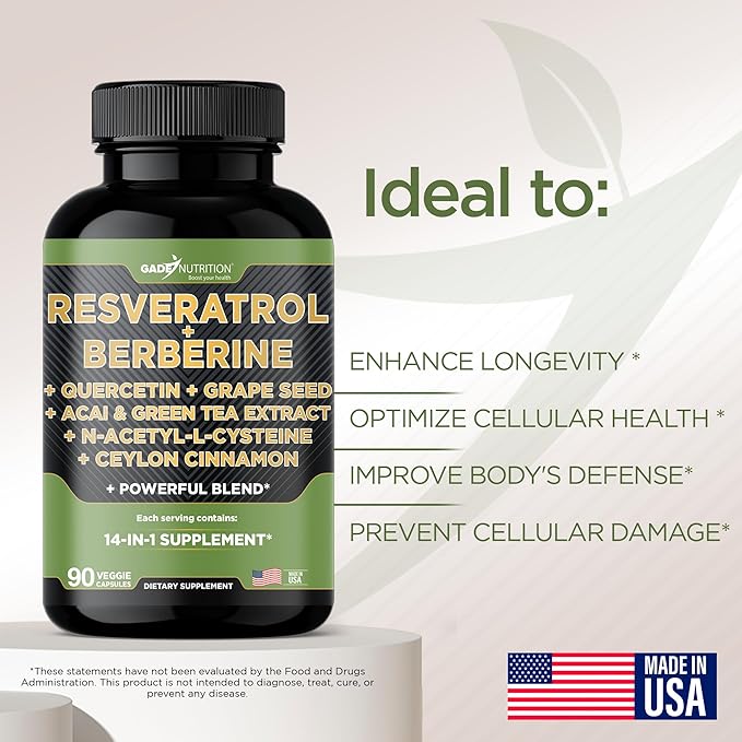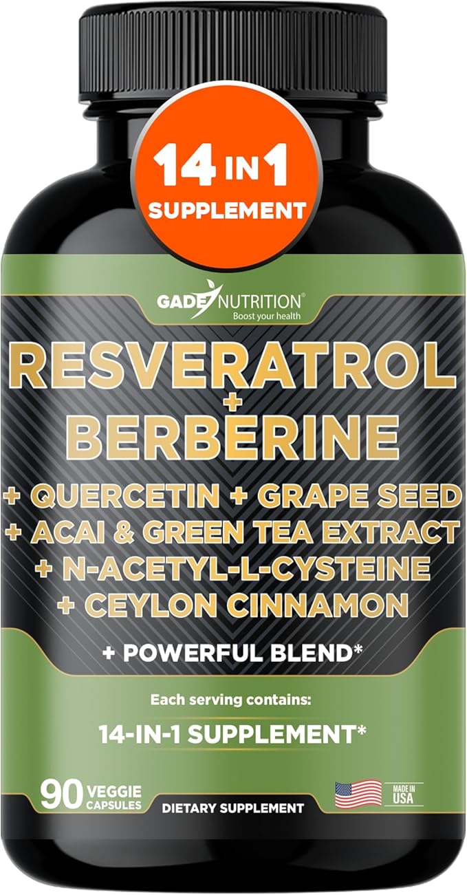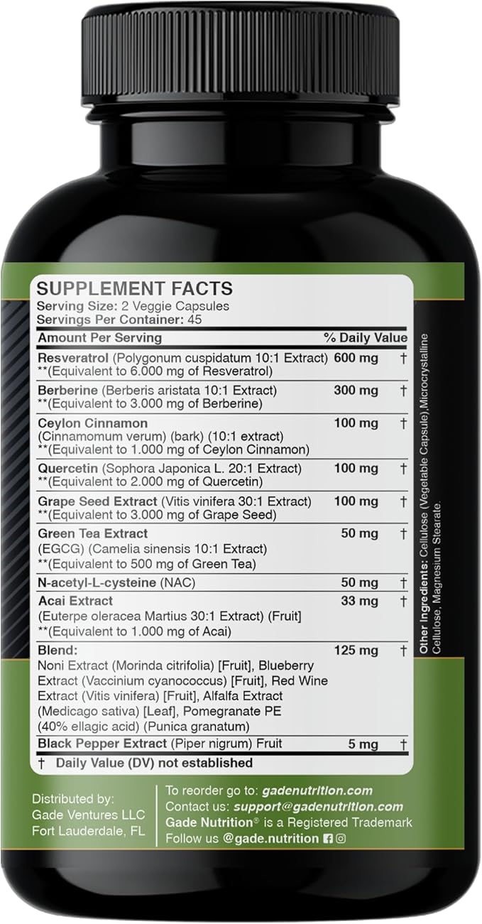 Gade Nutrition Resveratrol Berberine Quercetin Grape Seed Extract Green Tea Extract N-Acetyl Cysteine - 14 in 1 Complex Supplement for Women & Men with Potent Antioxidants - Made in USA