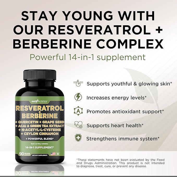 - ANTIOXIDANT-POWERED BLEND - Discover the transformative benefits of our premium Resveratrol + Berberine + Quercetin + Grape Seed + Acai & Green Tea Extract + N-Acetyl-L-Cysteine + Ceylon Cinnamon blend. Carefully crafted, this supplement combines some of nature’s most potent antioxidants and bioactive compounds, delivering comprehensive support for vitality and well-being. Designed for those who seek optimal health, this blend is your ally in maintaining balance and energy in a fast-paced world.