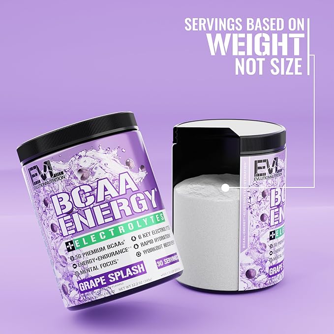 EVL BCAAs Amino Acids Powder - BCAA Energy Pre Workout Powder for Muscle Recovery Lean Growth and Endurance - Rehydrating Post Workout Recovery Drink with 6 Key Electrolytes - Grape Splash