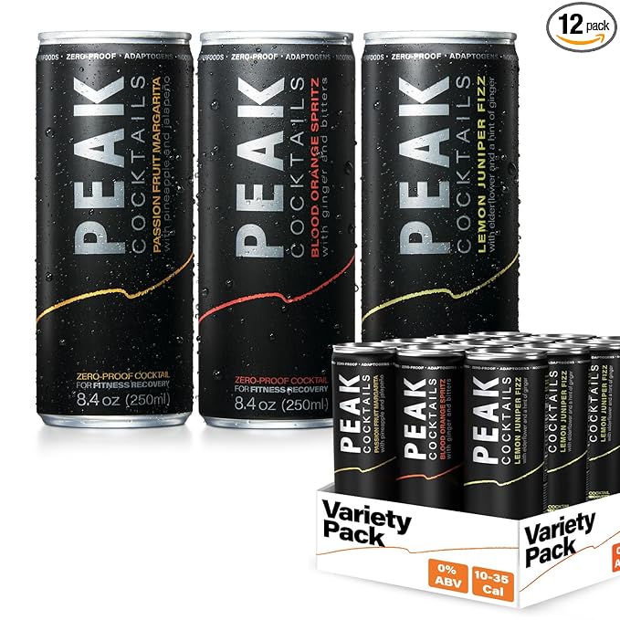 Peak Cocktails Non-Alcoholic Cocktail | Adaptogens, Nootropics, Superfoods for Recovery, Calm, Sleep | Ashwagandha, Tart Cherry, L-Theanine | Mixologist-crafted | 8.4 oz, 12-Pack Variety Pack