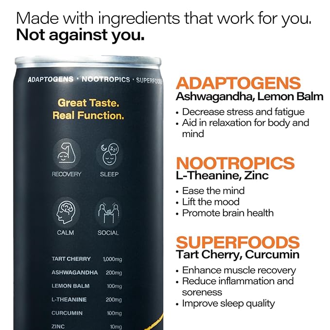 - DESIGNED FOR ATHLETES, ENJOYED BY ALL: Each can is packed with adaptogens, nootropics, and superfoods to help you relax easier, recover faster, sleep deeper, and enjoy social moments without missing a beat.