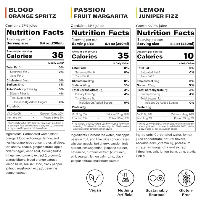 - TRY EVERY FLAVOR: The variety pack contains all 3 mixologist-crafted flavors: Passion Fruit Margarita (tart and spicy), Blood Orange Spritz (citrus and bitter), and Lemon Juniper Fizz (light and botanical). Each flavor is crafted with real natural ingredients.