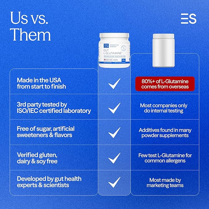 - Essential Stacks Gut L-Glutamine Powder: Pure l glutamine powder that is made exclusively in the USA and free from competing ingredients to support your gut health