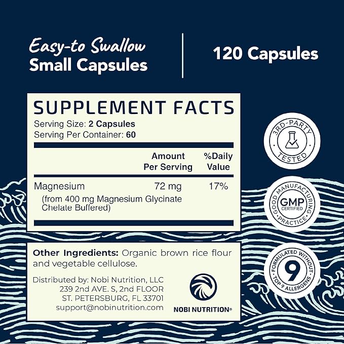- MADE WITH YOU IN MIND: Magnesium Glycinate Chelated by Nobi Nutrition is Third-Party Tested and formulated gluten-free, non-GMO, vegan, vegetarian, and without the top 9 allergens. It is manufactured in a facility that adheres to GMP guidelines.