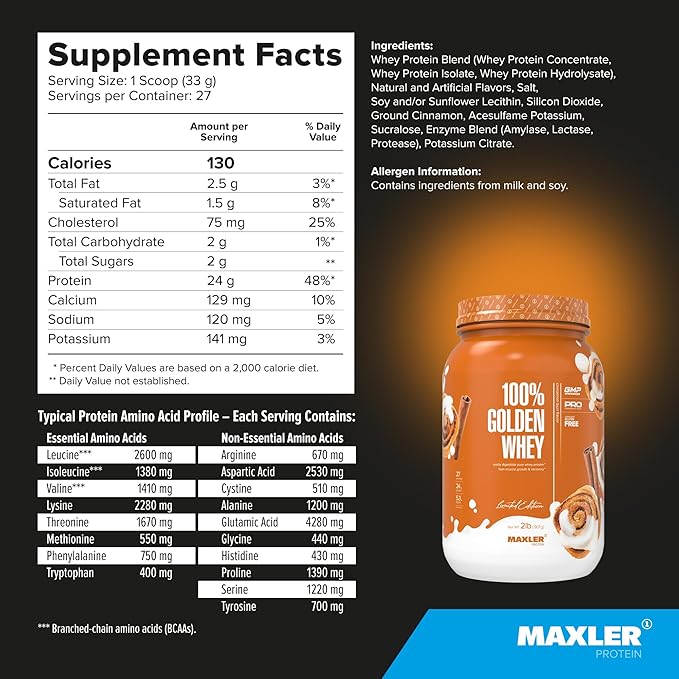 - Made in USA. Maxler 100% Golden Whey protein cinnamon bun flavor is designed and manufactured in compliance with GMP Standards
