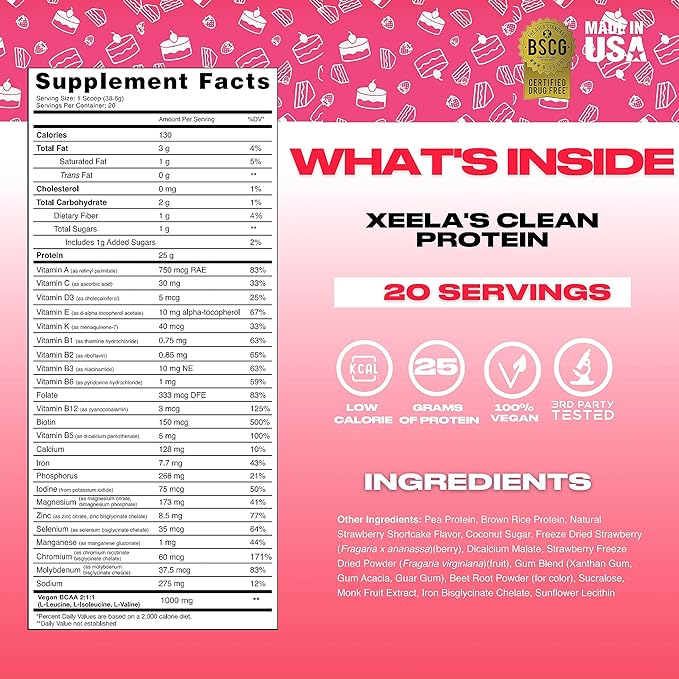 XEELA Plant Based Vegan Protein Powder - Independently Tested - 25g High Protein, Pea Protein for Men & Women - Vitamins & Minerals, Non GMO, Dairy & Gluten Free, LowCarb & LowFat (Strawberry Cake)