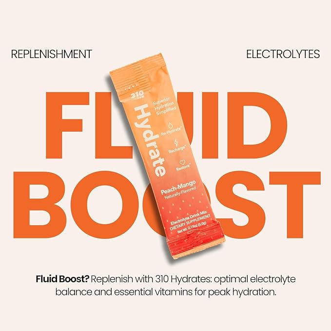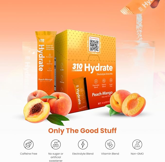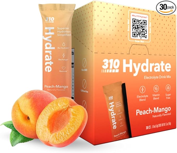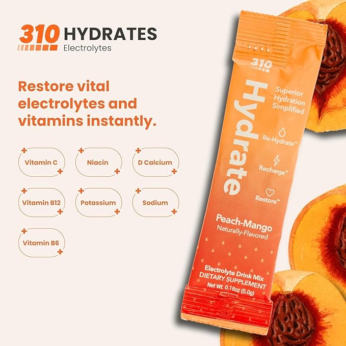 310 Hydrate Peach Mango Electrolytes Powder Packets - No Sugar Hydration Packets with Key Vitamins & Minerals - Keto Friendly - Tasty Sugar Free Electrolyte Drink - 30 Single Servings