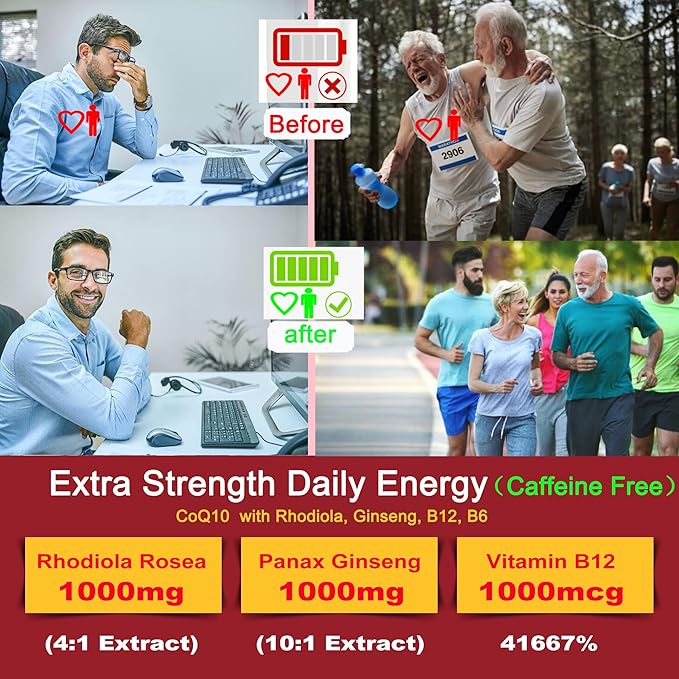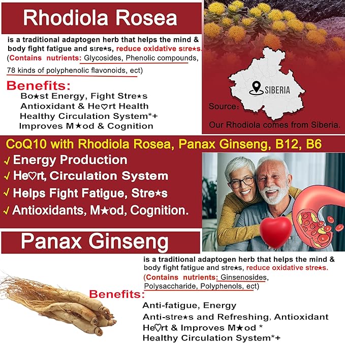 - CoQ10 wth Ginseng, Rhodiola Rosea Extract, Vitamin B6, B12.